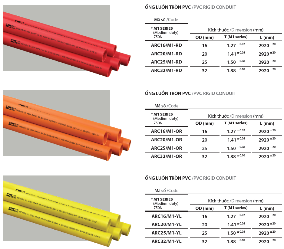Ống luồn PVC thương hiệu AC sản xuất theo 4 dòng sản phẩm:  Nhẹ, Trung bình M, Trung bình M1 và Nặng.